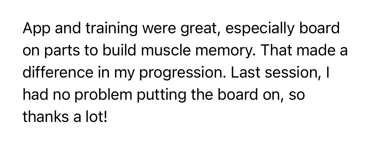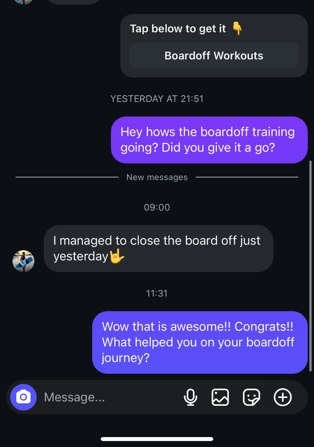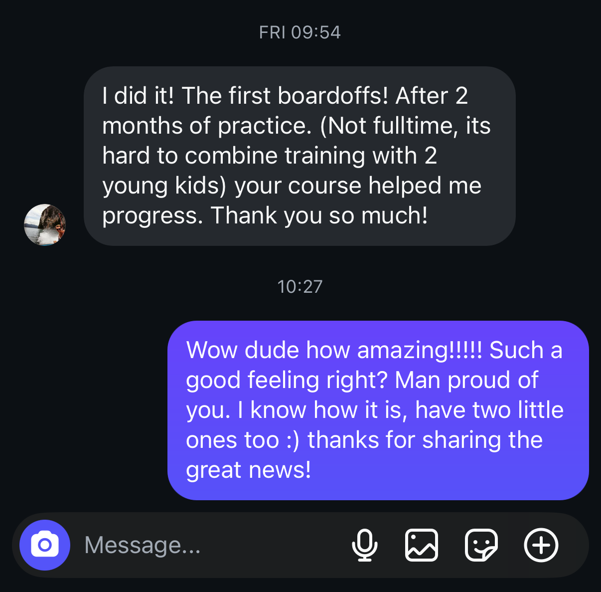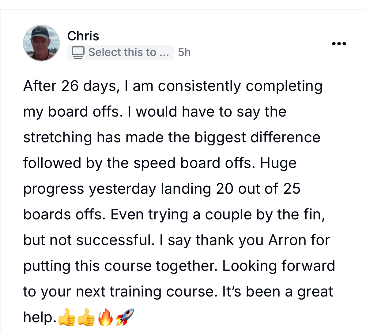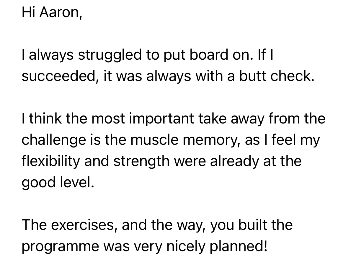 Daily 15min of boardoff specific workout videos for a period of 28 days. Alternating between core, flexibility and leg workouts.Ā